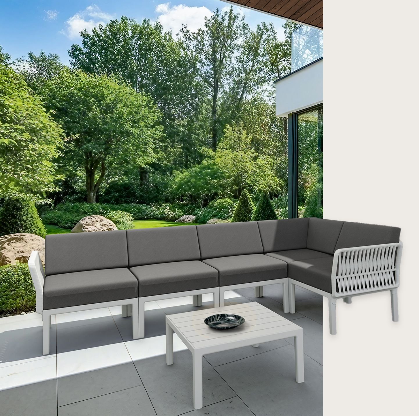 A spacious and adaptable corner lounge set created to elevate both indoor and outdoor environments. Built from weather-resistant resin reinforced with glass fiber, it ensures durability without the risk of rust or decay. The UV-protected finish preserves color over time, while the smart screwless system allows flexible positioning of the backrest and armrests.