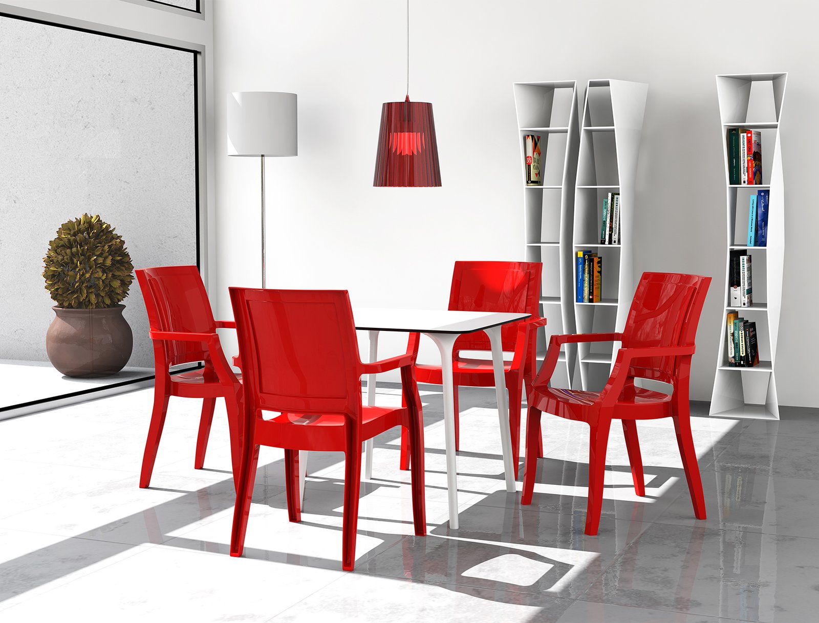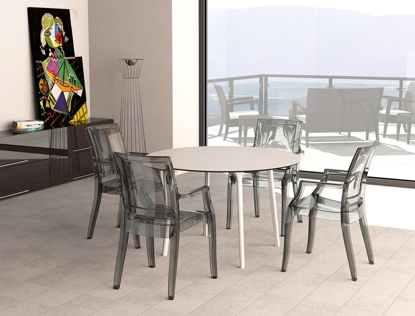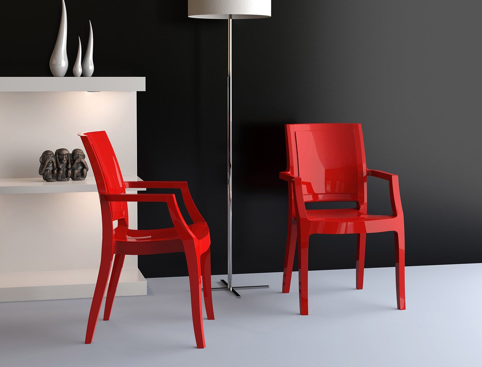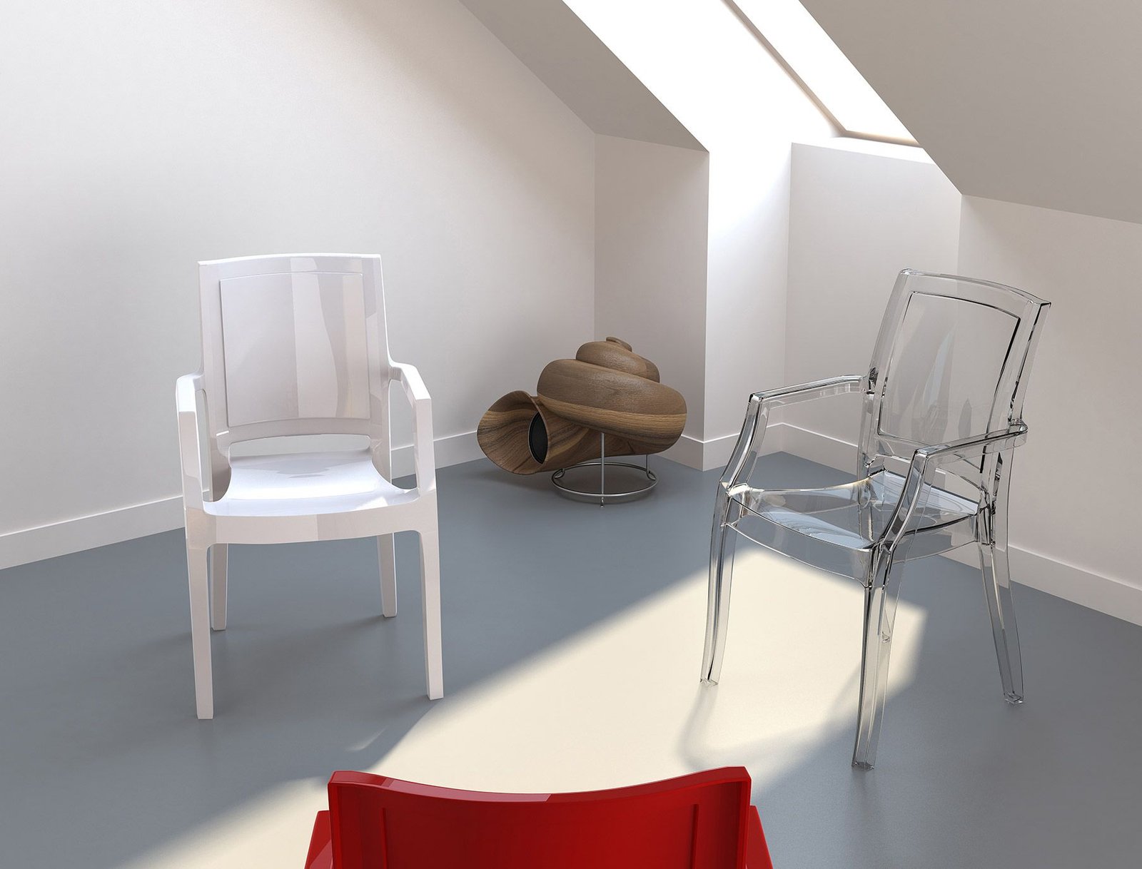 Stacking armchair for indoor and outdoor use in shiny technopolymer PA6 nylon or clear polycarbonate. Scratch resistant, self – extinguish classification V2, UV – resistant.