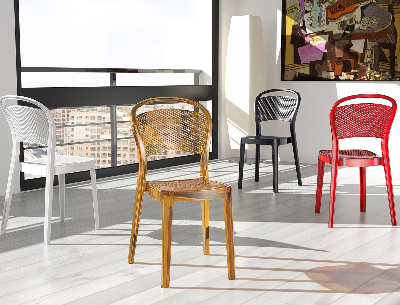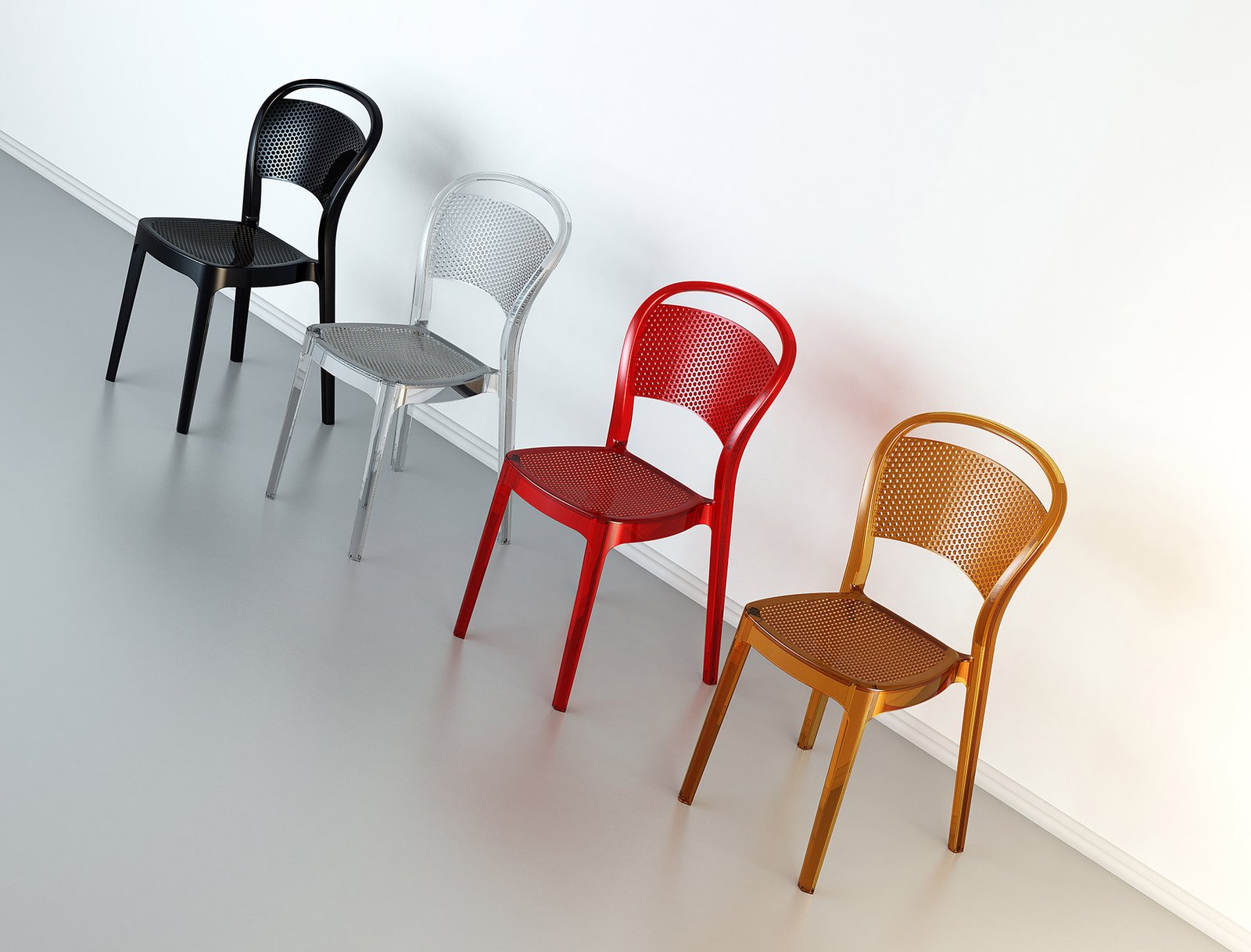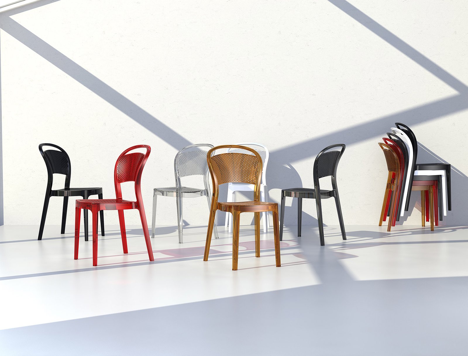 Stacking chair for indoor and outdoor use in clear or shiny polycarbonate. Scratch resistant, UV – resistant.