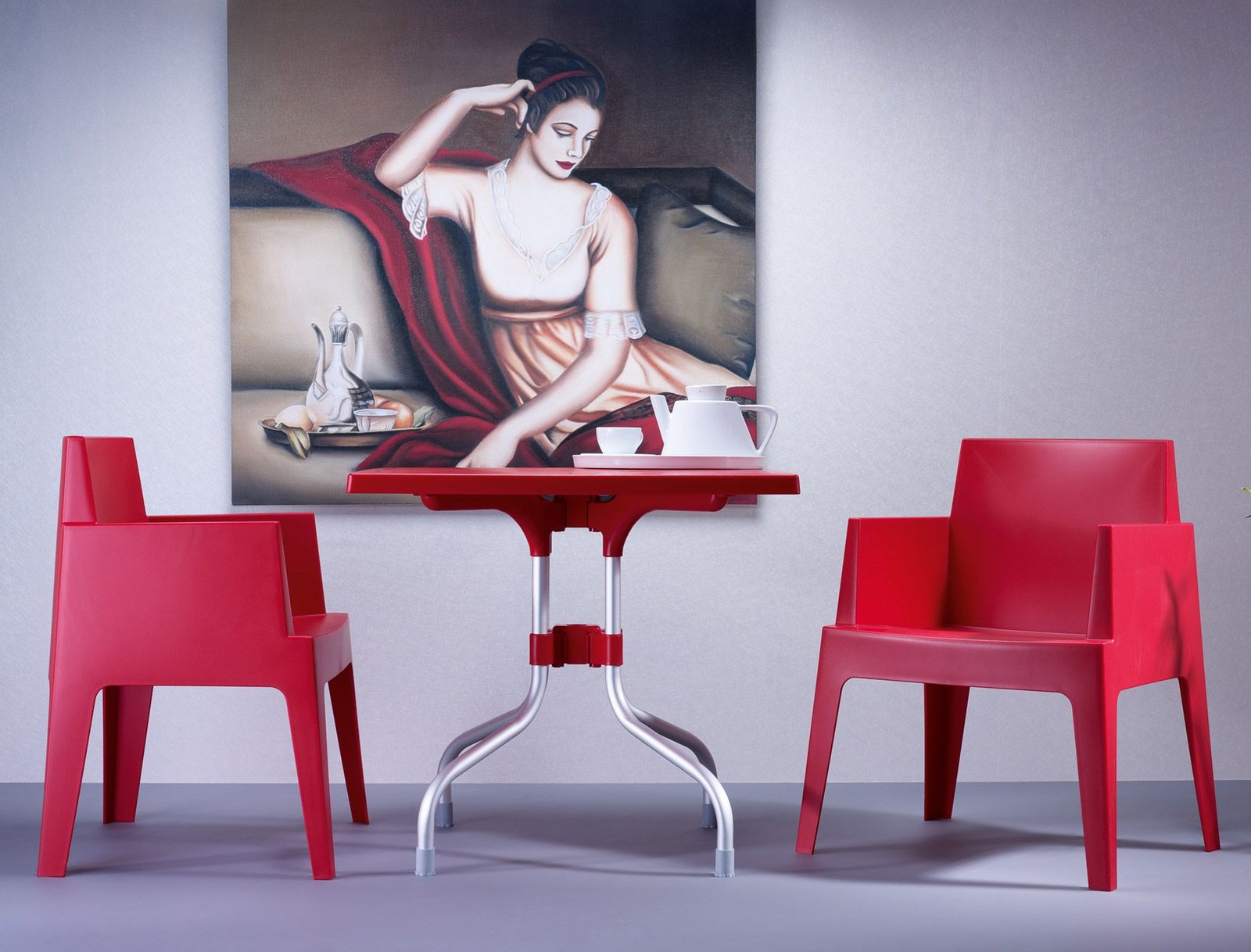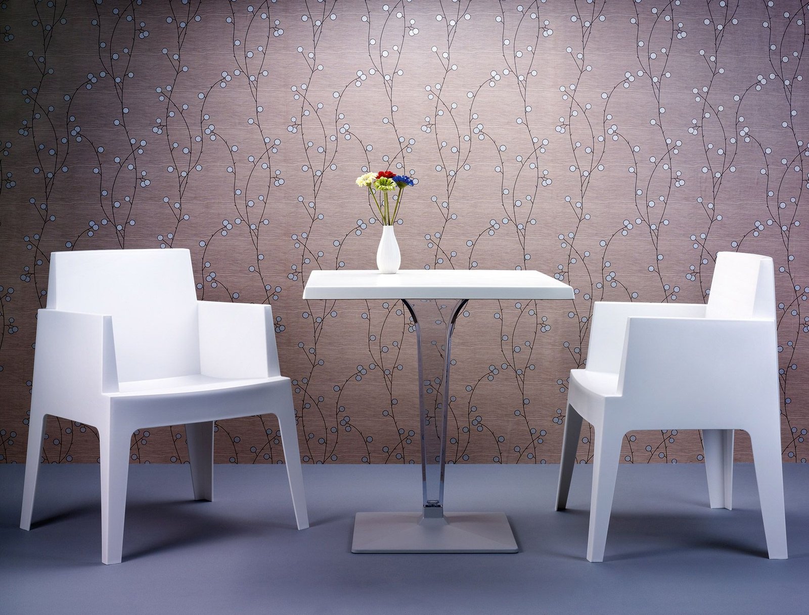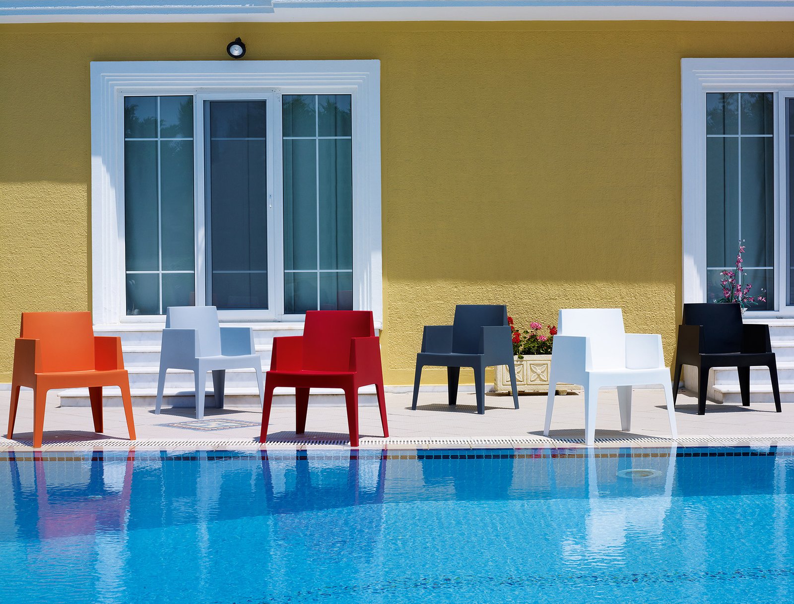 Recyclable polypropylene stacking armchair, strong and stable. Suitable for outdoor contract use.