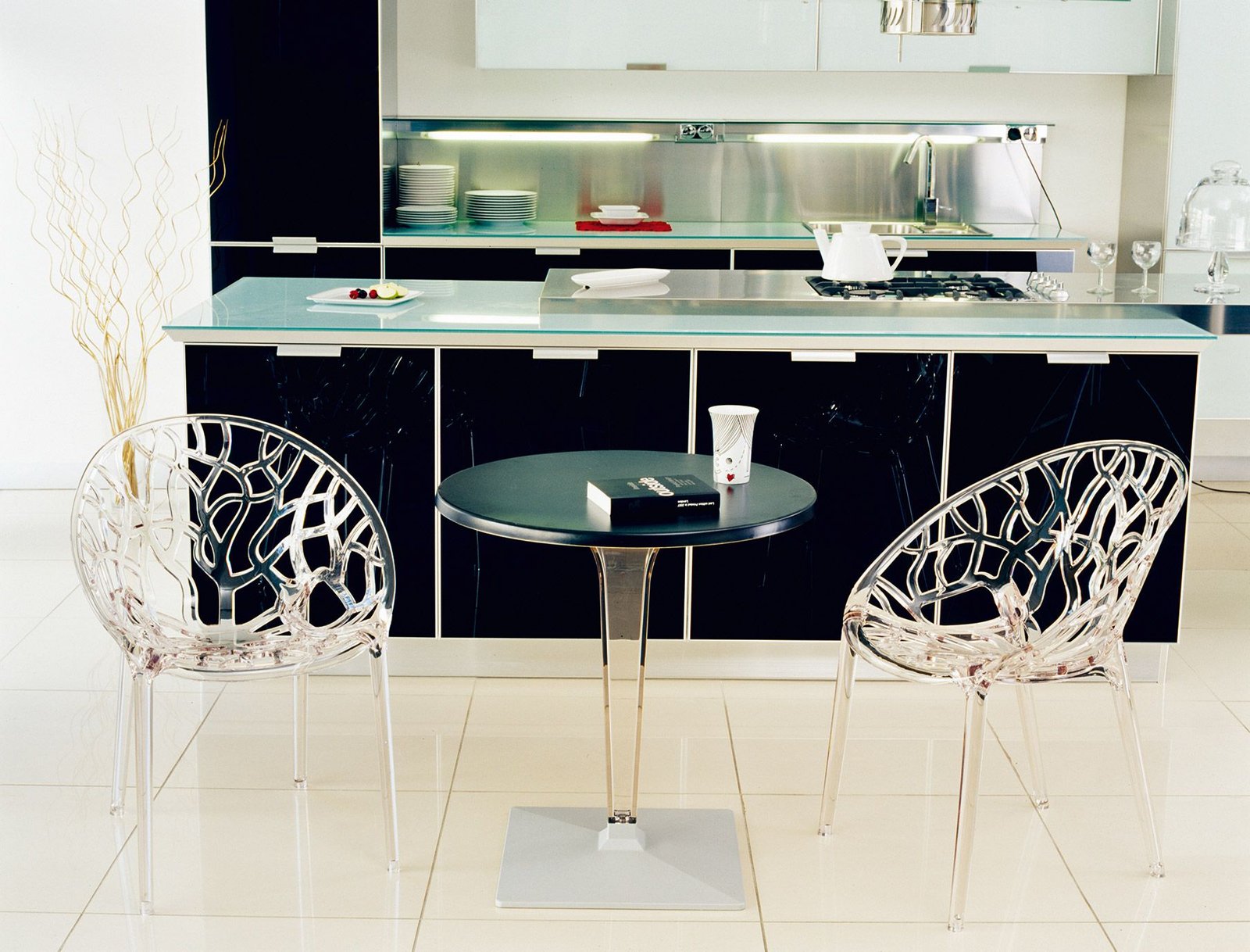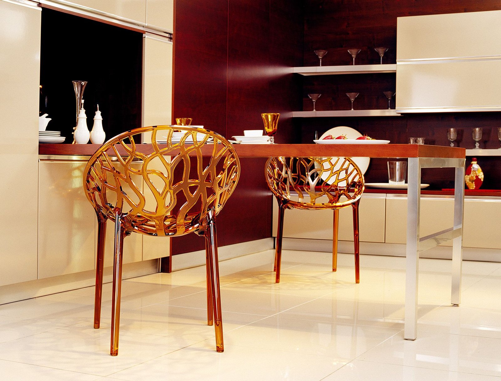 Stacking armchair for indoor and outdoor use in clear polycarbonate moulded with gas technology of the second generation. Scratch resistant, UV – resistant.