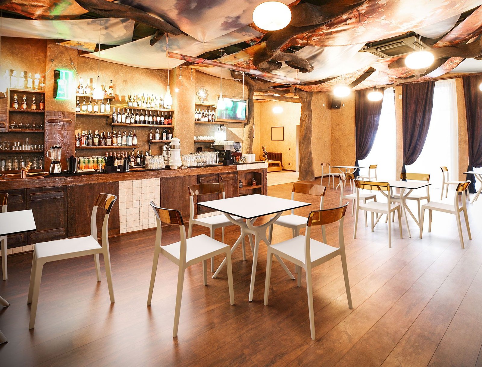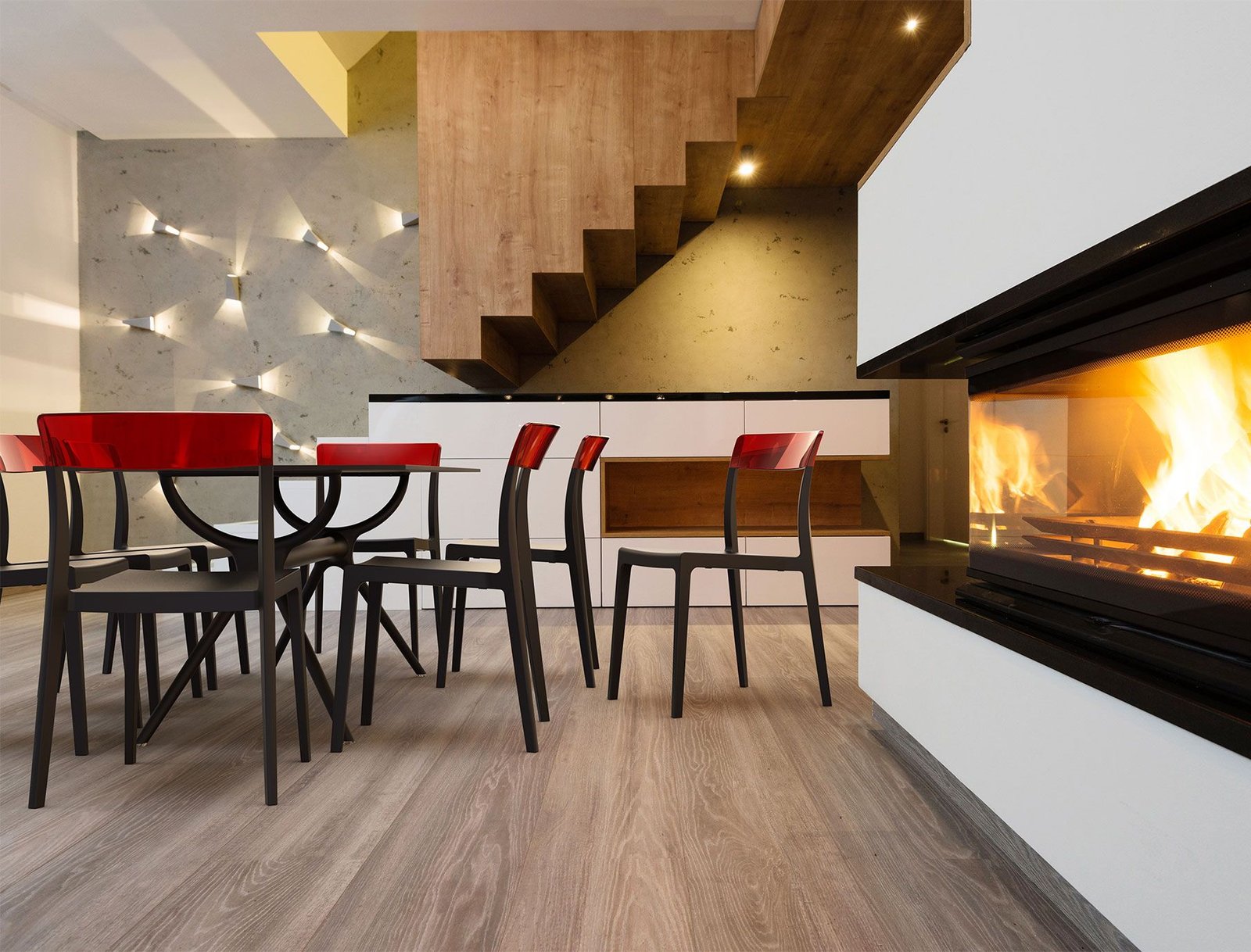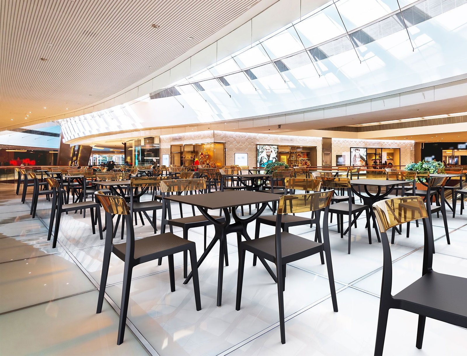 Stacking chair with the latest generation of air moulding thermoplastic injection. Seat in polypropylene reinforced with glass fiber, backrest in transparent polycarbonate. For indoor and outdoor use.