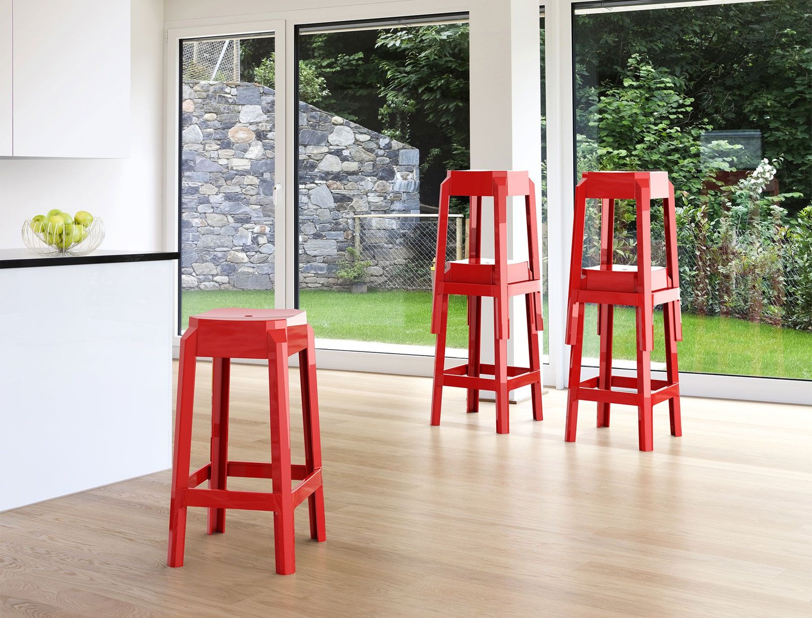 Stacking bar stool h.65 cm for indoor and outdoor use in shiny technopolymer PA6 nylon or clear polycarbonate. Scratch resistant, self – extinquish classification V2, UV – resistant.