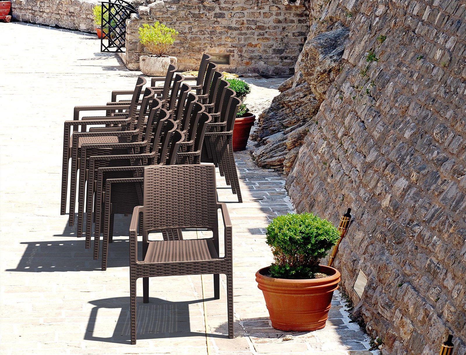 Ibiza armchair is stackable and made of durable weather-resistant resin reinforced with glass fiber. Non-metallic frame will never unravel, rust or decay. It is UV protected which insures the colors will not fade. For indoor and outdoor use.