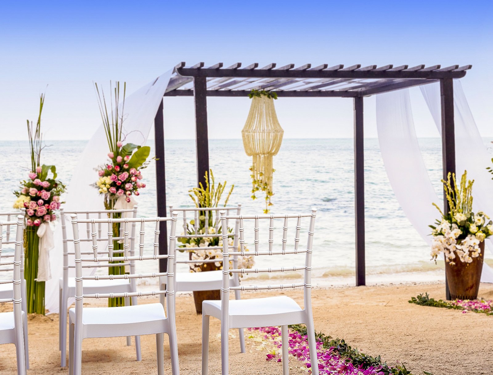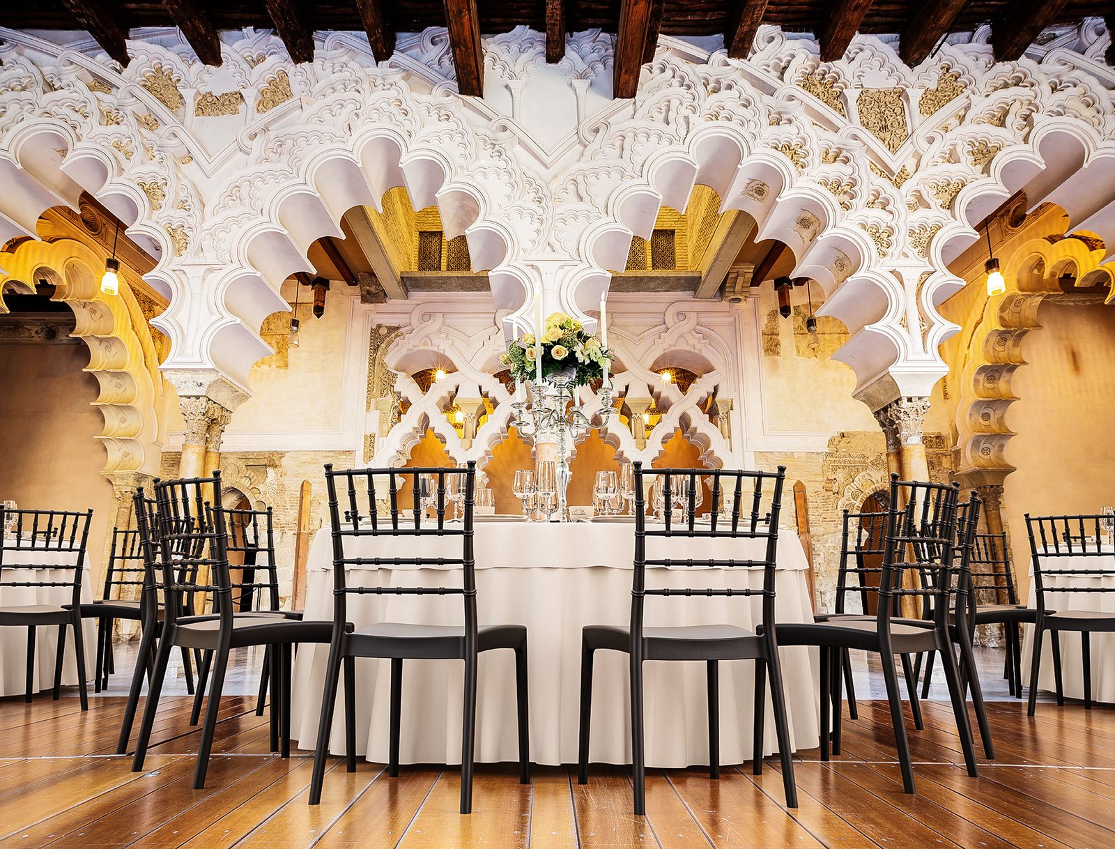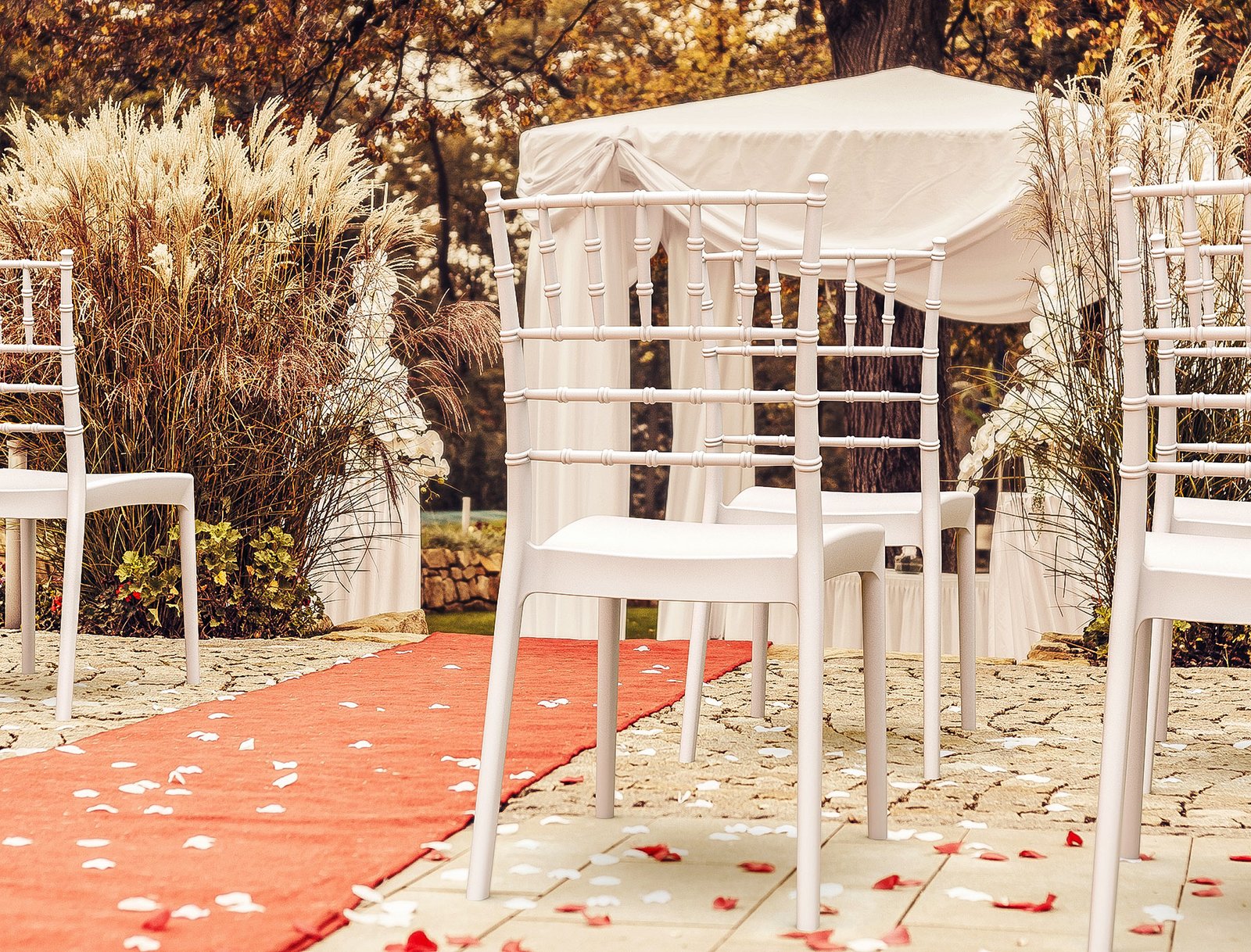 Josephine wedding chair is produced with a single injection of polypropylene reinforced with glass fiber obtained by means of the latest generation of air moulding technology with neutral tones. For indoor and outdoor use.