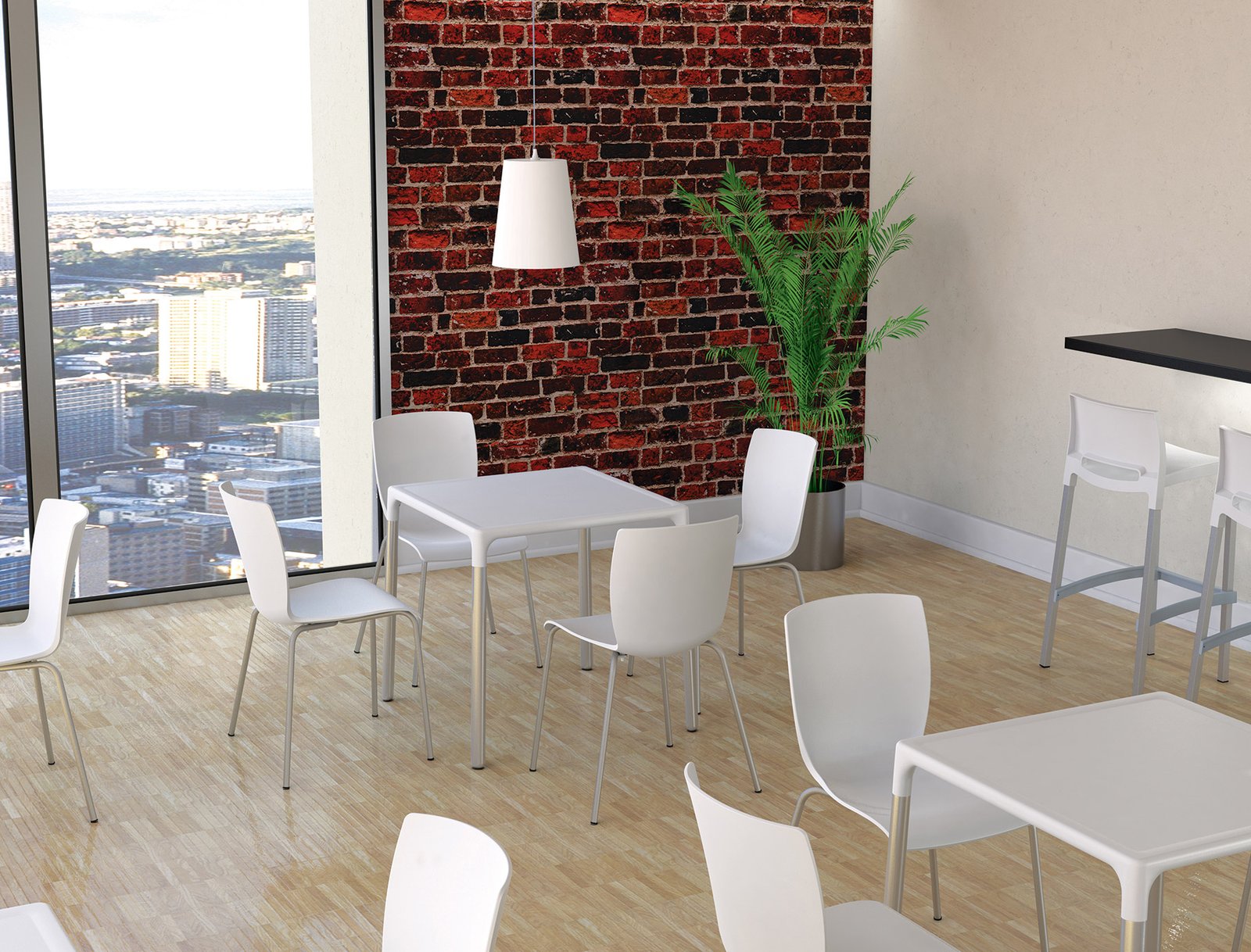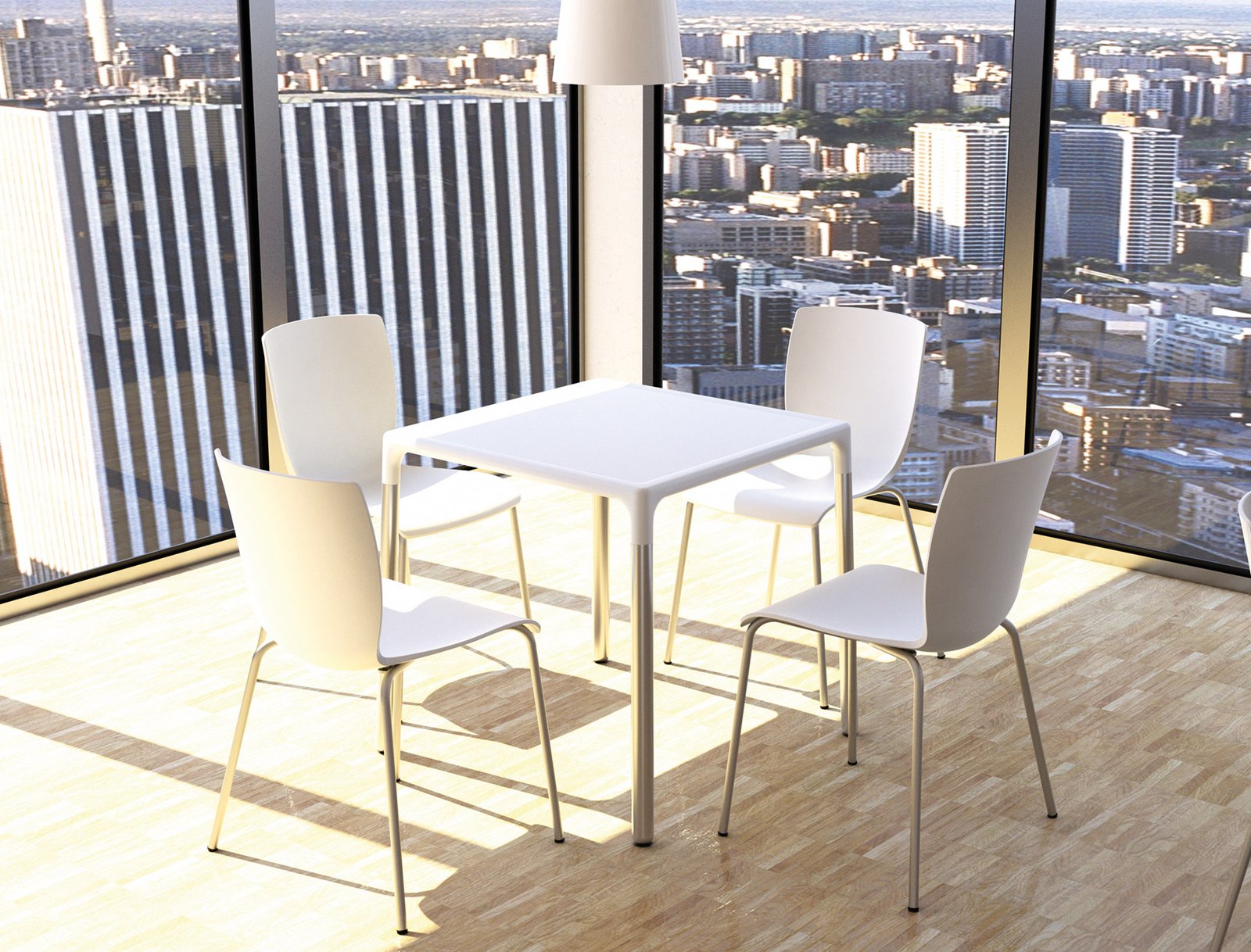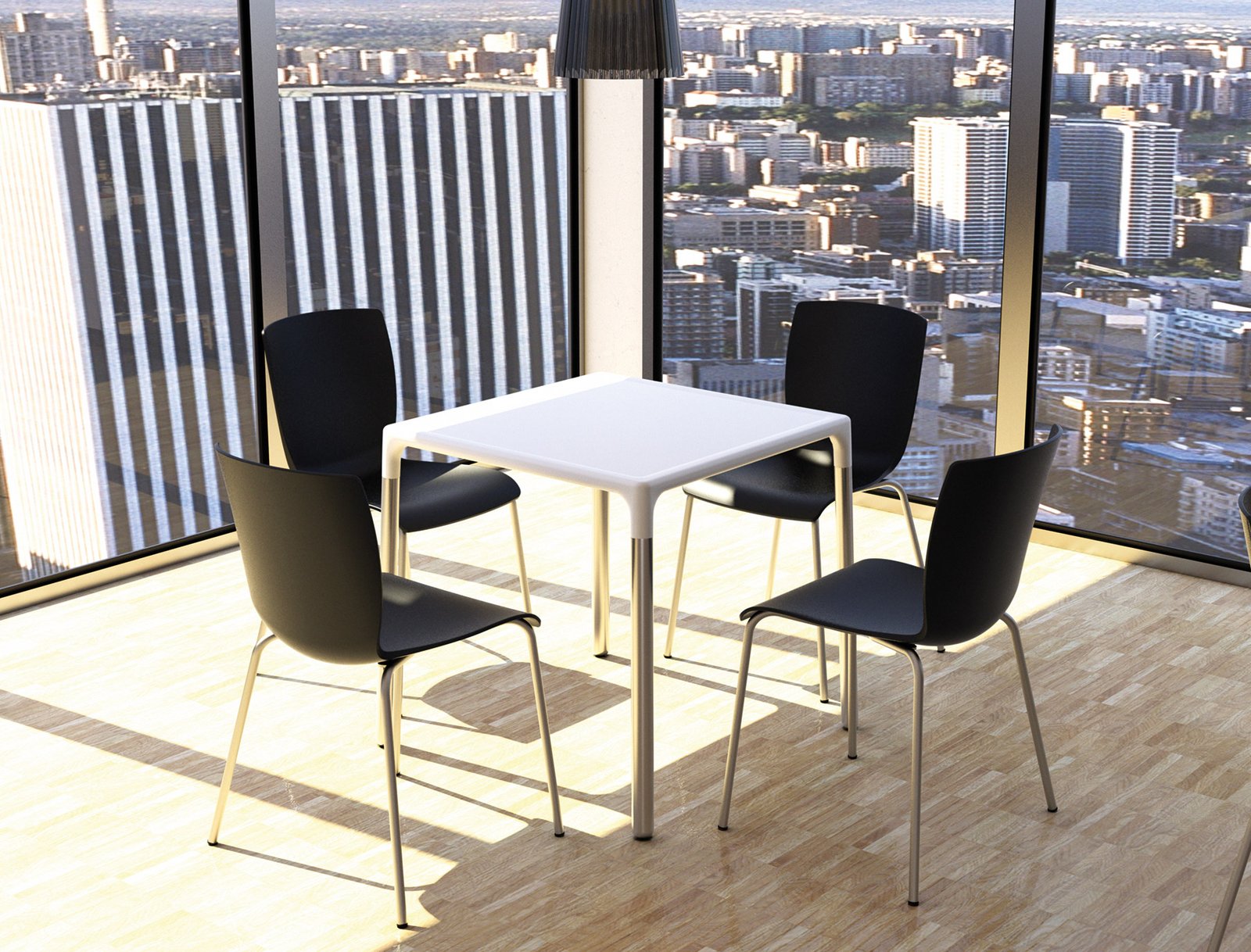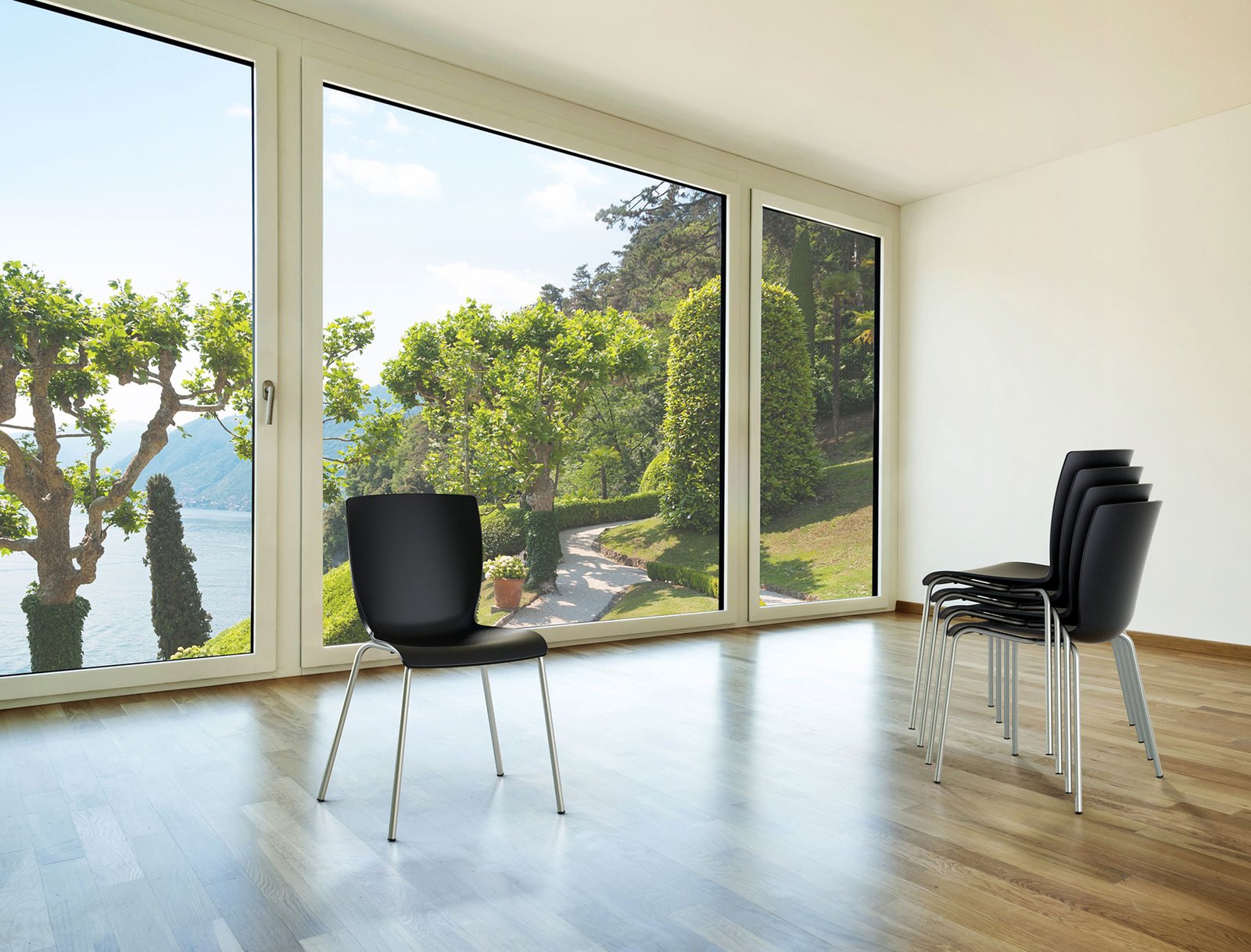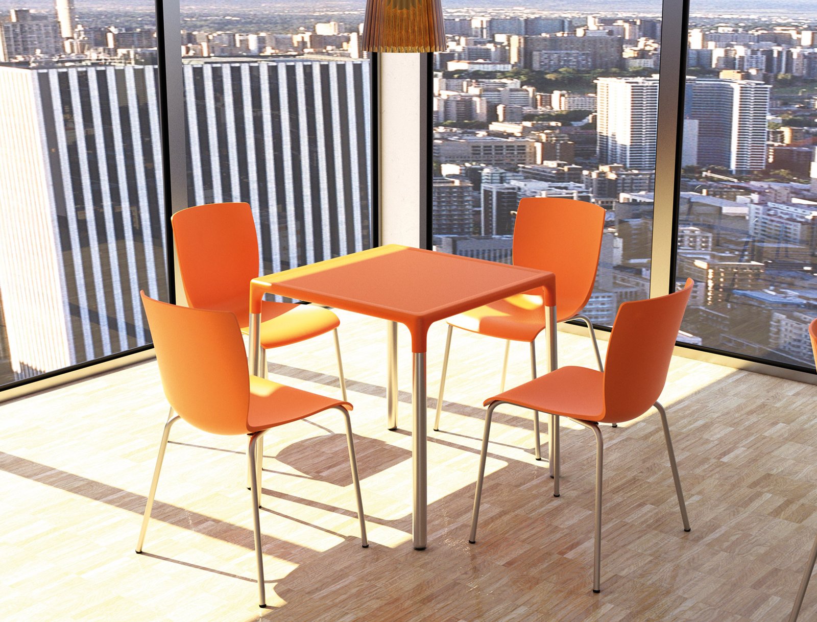 Stacking chair with recyclable polypropylene seat and backrest and painted steel legs. For indoor use.
