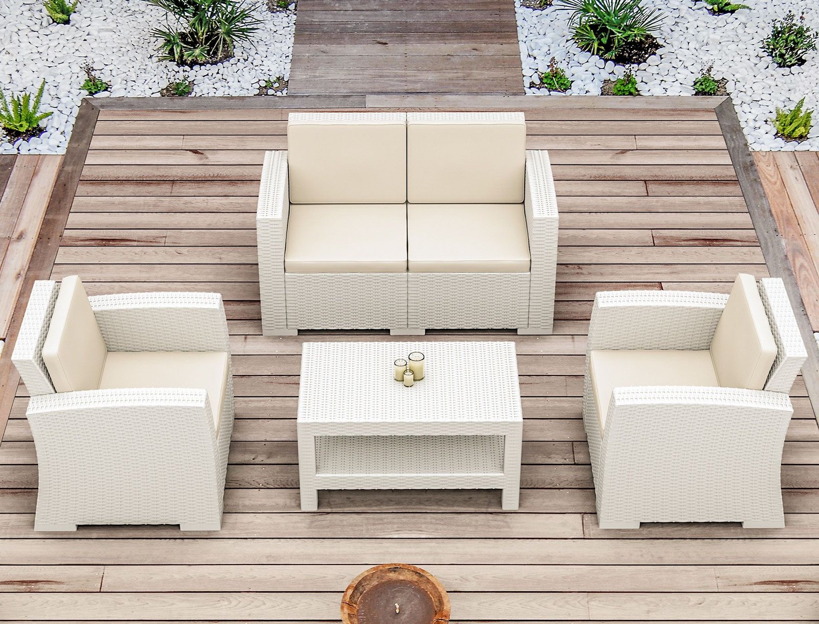 Monaco Lounge Set is designed for easy self assembly, it is made of durable weather-resistant resin reinforced with glass fiber. Non-metallic frame will never unravel, rust or decay. It is UV protected which insures the colors will not fade. Can be disassembled. For indoor and outdoor contract use. Can be purchased as set or separately. 7 cm thick cushion set covered with polyster fabric and finished with piping. Cushions are specially designed for Monaco Lounge Set.