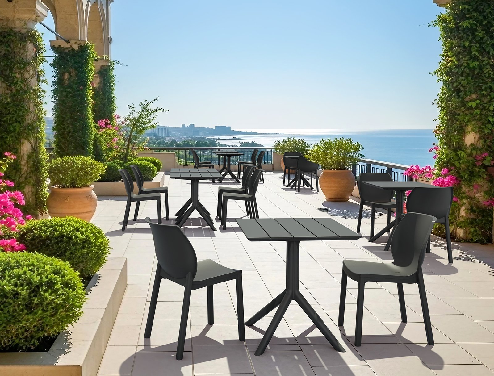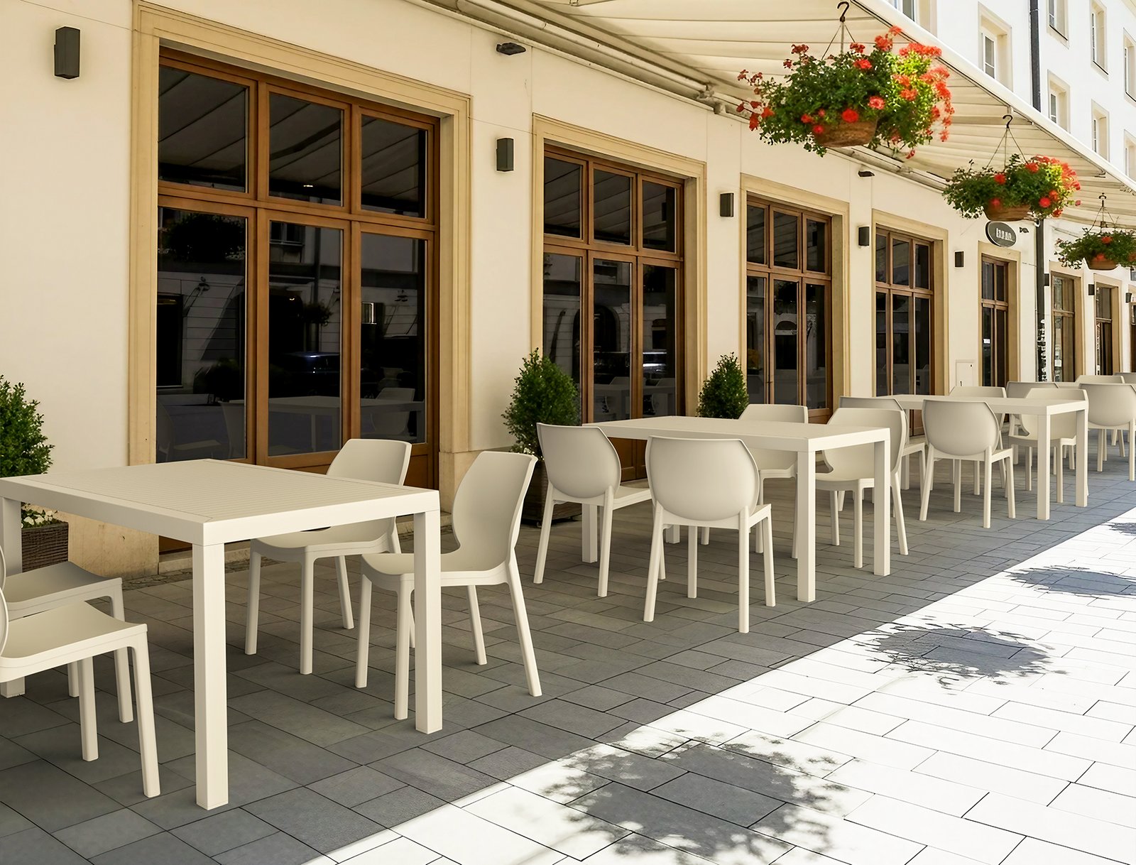 Nora chair reinforced with glass fiber features refinement and a design carefully prepared down to the smallest detail. Practical and functional, it has non-skid rubber caps, tubular legs and is stackable. For indoor and outdoor use.