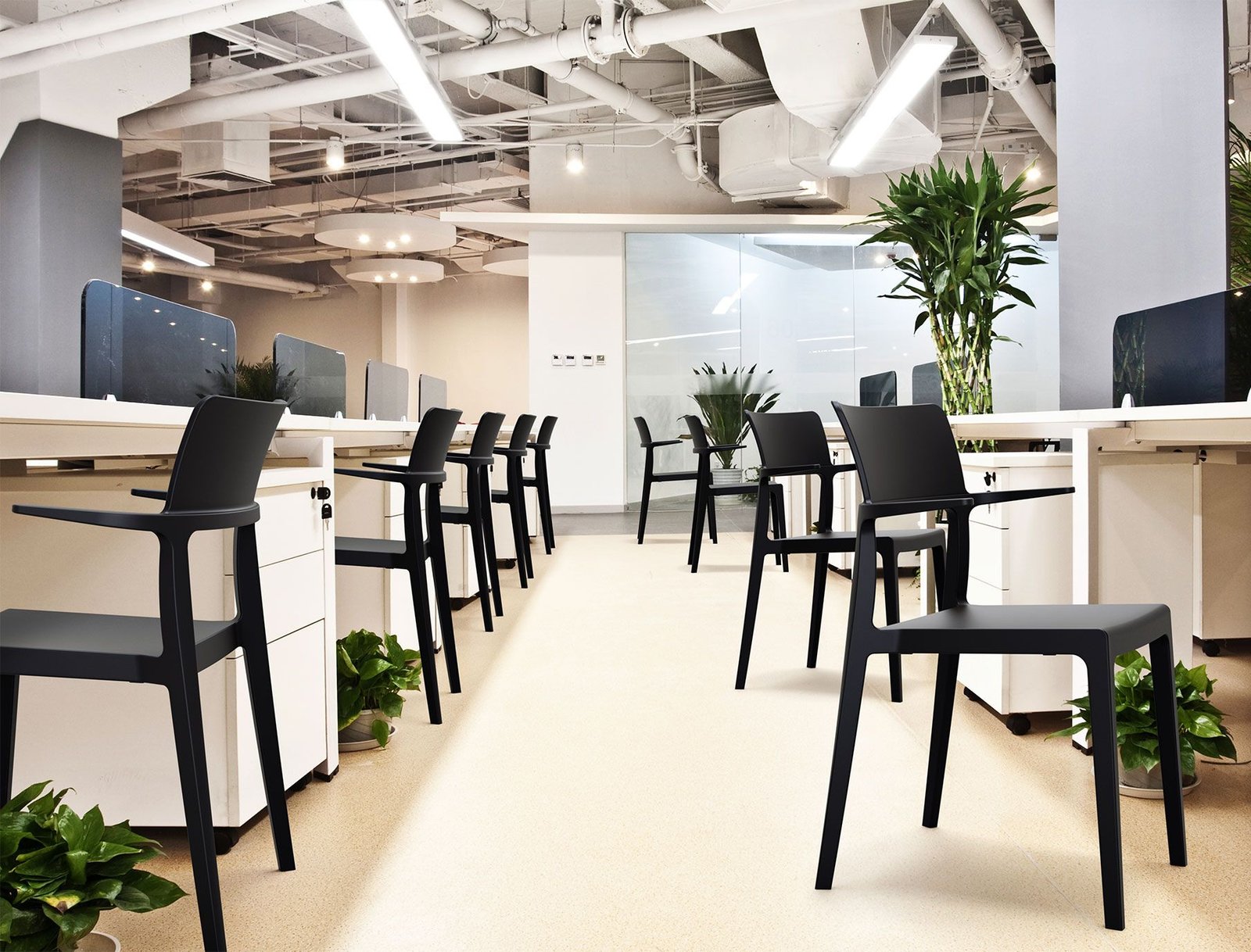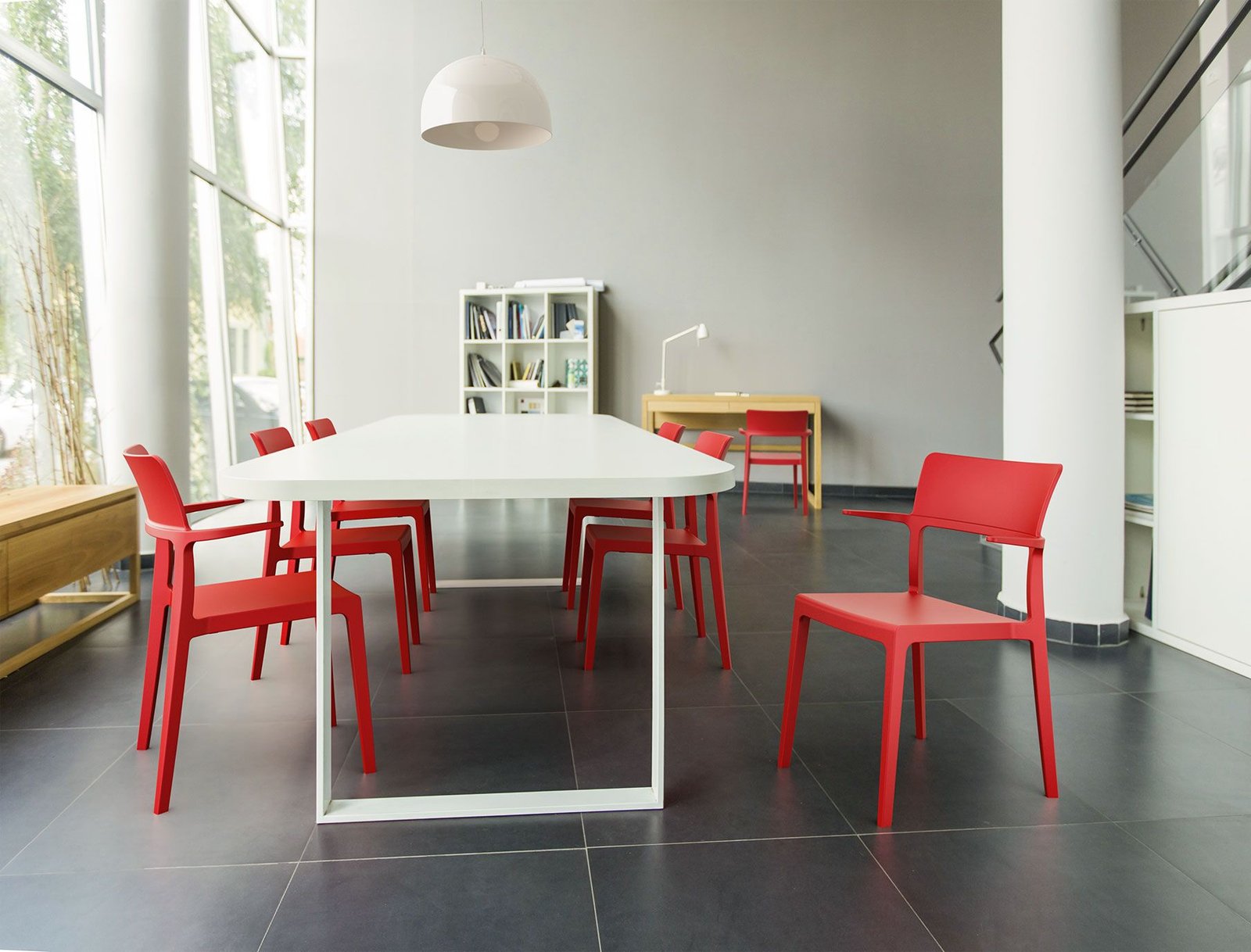 Plus armchair is produced with a single injection of polypropylene reinforced with glass fiber obtained by means of the latest generation of air moulding technology with neutral tones. For indoor and outdoor use.