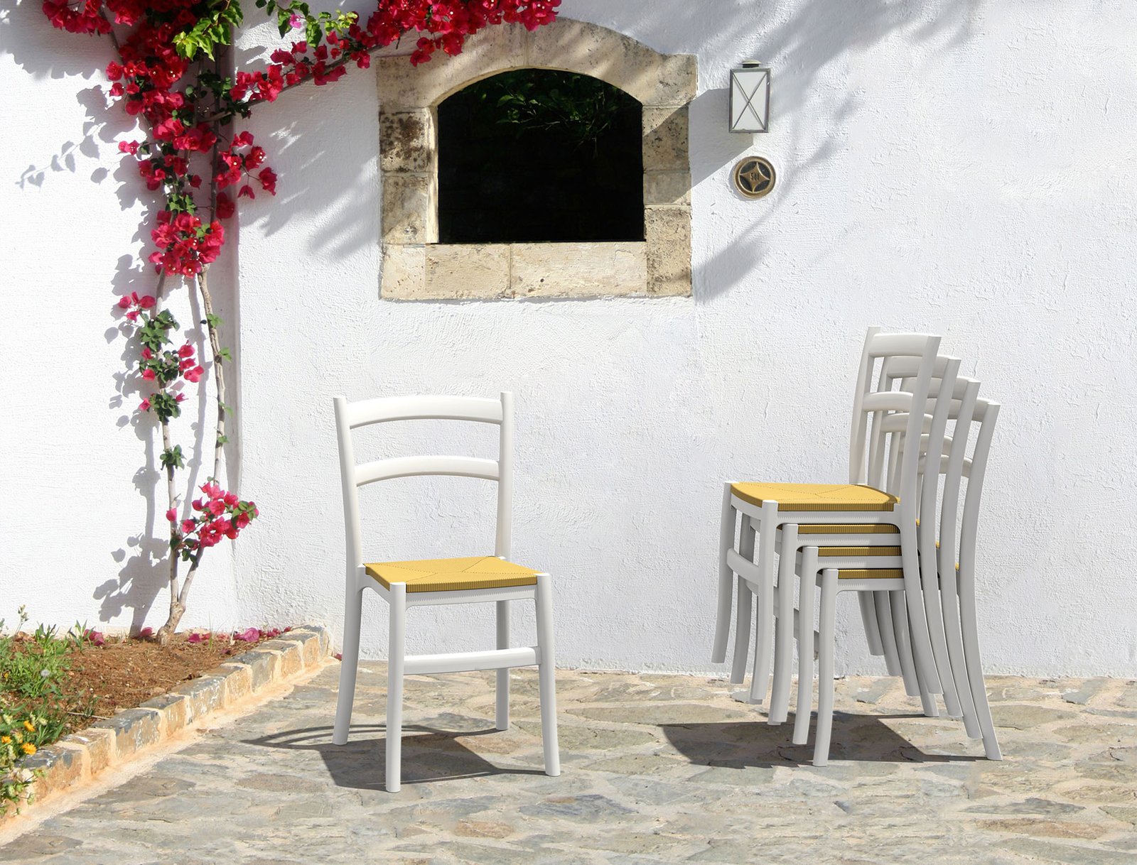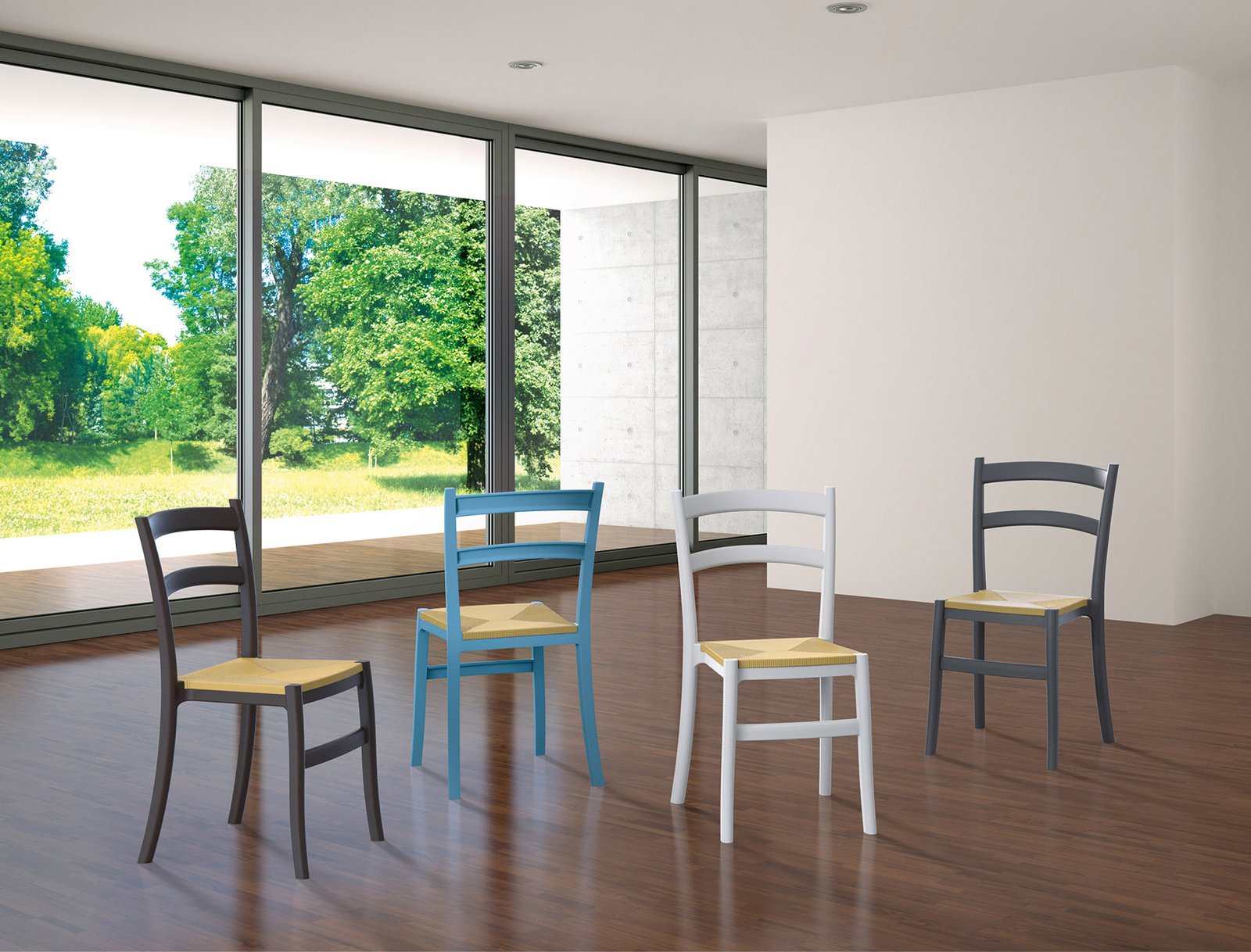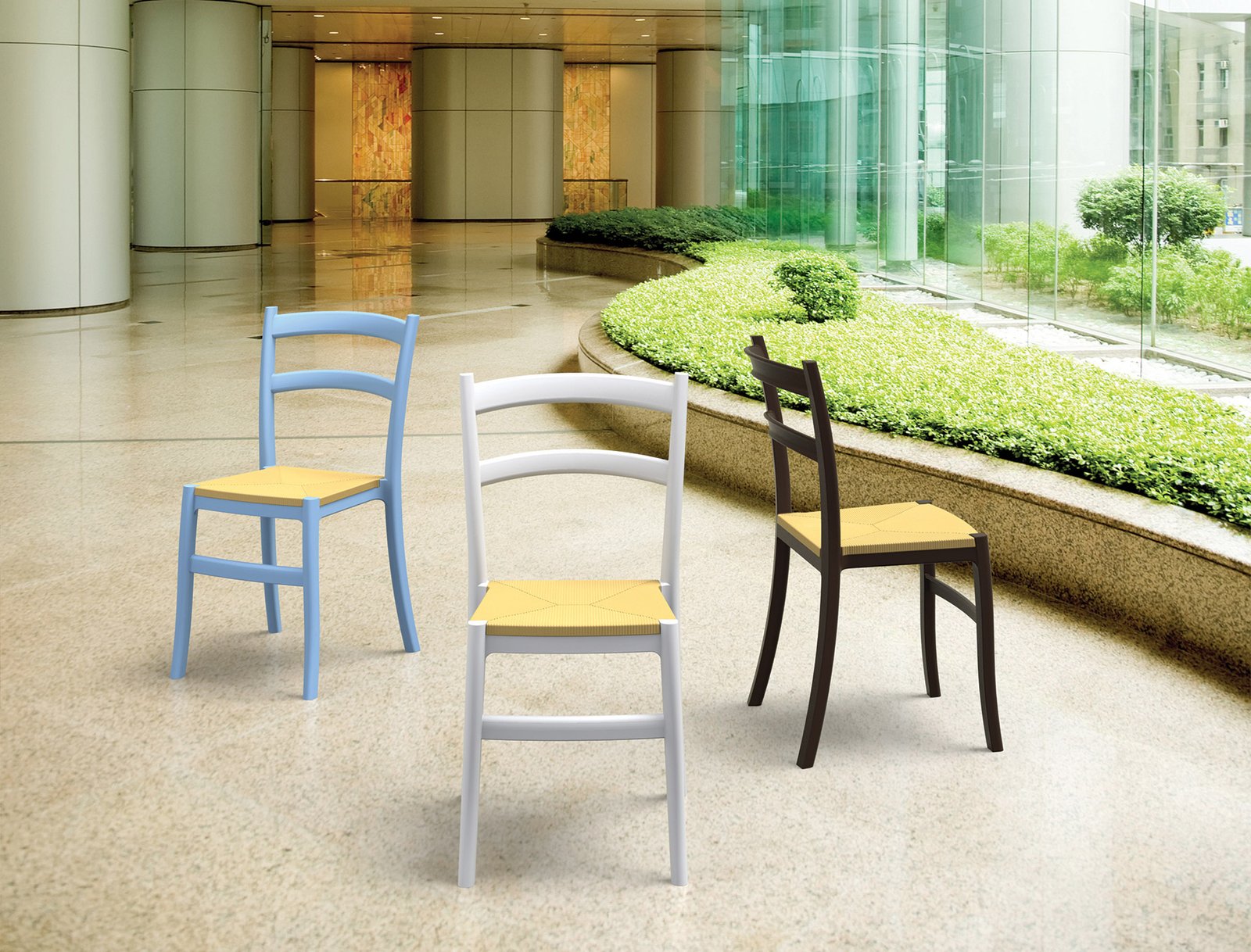 Tiffany-S chair is produced with a single injection of polypropylene reinforced with glass fiber obtained by means of the latest generation of air moulding technology with neutral tones. Stackable. For indoor and outdoor use.