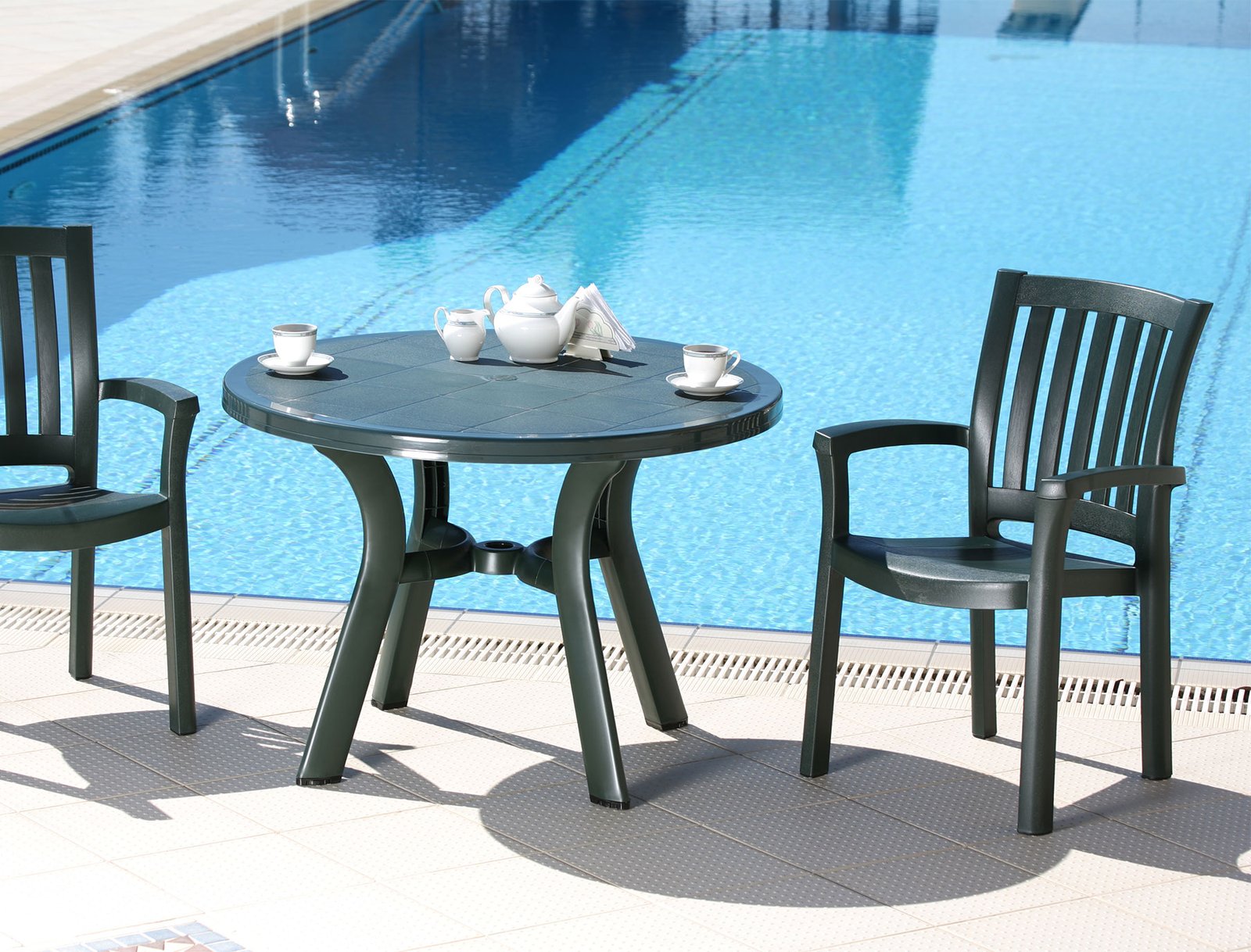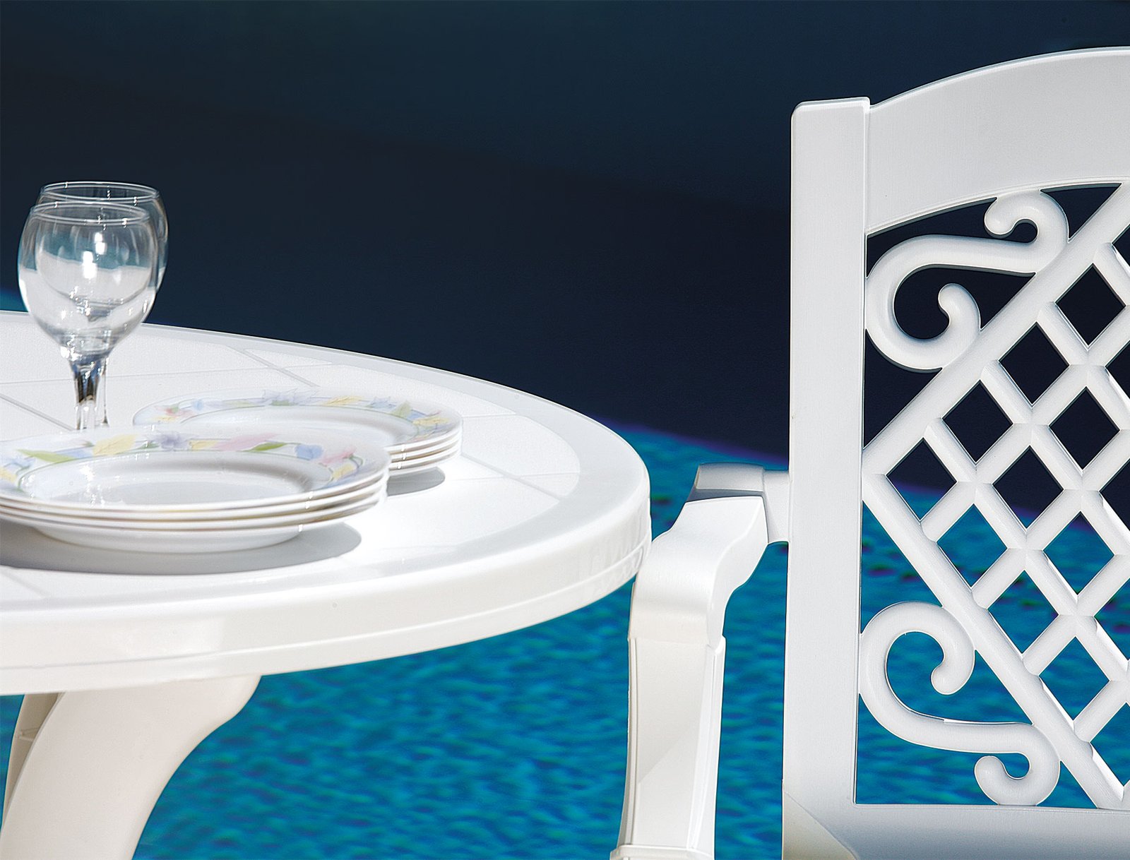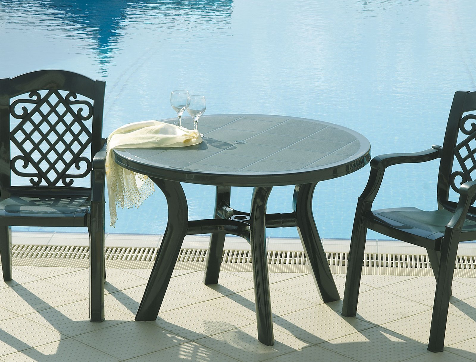 105 cm round table. The legs have slightly cornered design for beter Truva has a round shape. It is supported by four tubular legs, which are equipped with non-skid feet. It has a hole in the middle for an umbrella.