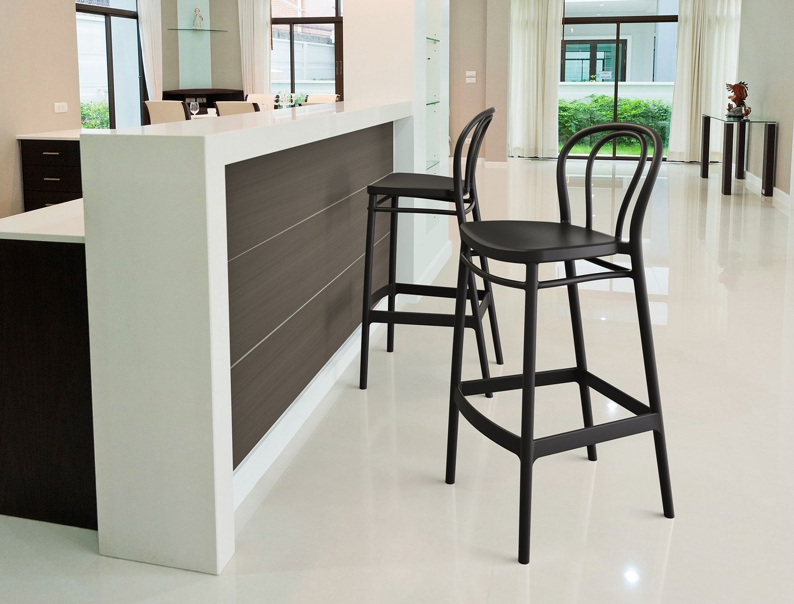 Victor bar stool h.75 cm is produced with a single injection of polypropylene reinforced with glass fiber obtained by means of the latest generation of air moulding technology with neutral tones. For indoor and outdoor use.